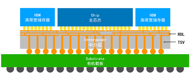 Interposer上的RDL使得各芯片之间的电信号可以直接交流,并通过Interposer中的硅通孔(TSV)传输到有机载板以完成与外界的连接。这种封装形式具有以下优点: